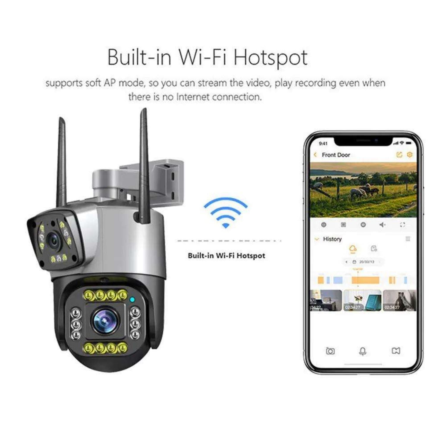 The V23 8MP camera features dual 4MP lenses. H.265x video format. and AI human detection for enhanced security. It offers clear day and night vision with 10 infrared LEDs and 10 white LEDs. making it perfect for round-the-clock surveillance. The built-in two-way audio with noise cancellation and multiple image modes ensure optimal performance.